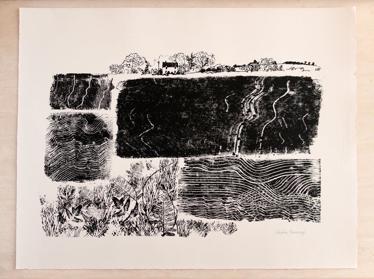 'Fields' is an original large single colour screen print. The paper measures 65cm by 50cm. Hand printed on beautiful cream 300 gsm Fabriano paper. Each print is hand signed in the bottom right corner.